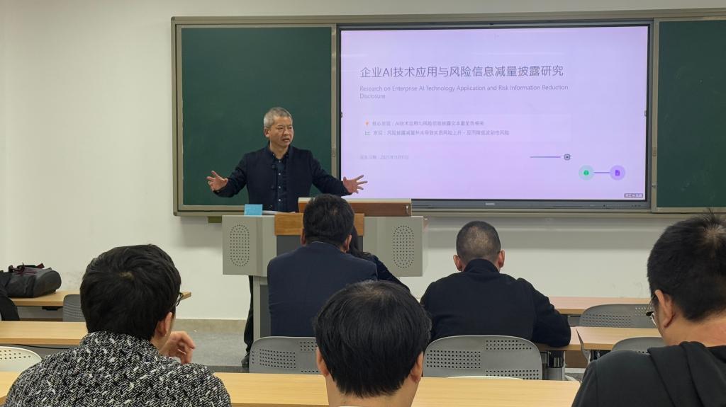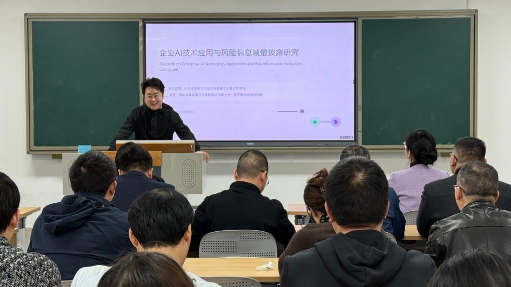 樊汝杰博士围绕企业 AI 技术应用对风险信息披露展开深入分享。他指出,AI技术通过提升信息透明度,重塑企业风险信息的传递机制,并对分析师关注、投资者调研等传统外部信息渠道形成一定替代,从而降低了对冗长文本式风险披露的依赖。他特别强调,在研发能力相对薄弱或公司治理水平较低的企业中,AI技术更能显著实现风险披露文本的“有效压缩”,这一发现为各类企业推进数字化转型提供了有针对性的实践启示。
