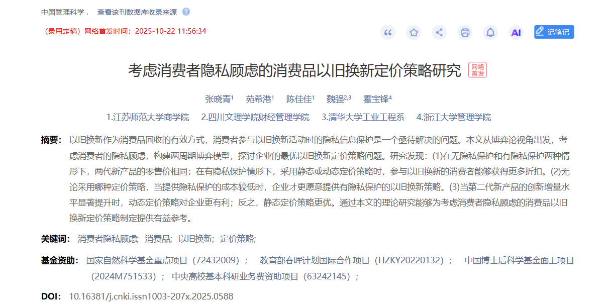 我院数字经济教研室魏强博士与浙江大学管理学院、江苏师范大学商学院的合作者合作撰写的论文《考虑消费者隐私顾虑的消费品以旧换新定价策略研究》发表于《中国管理科学》第10期。