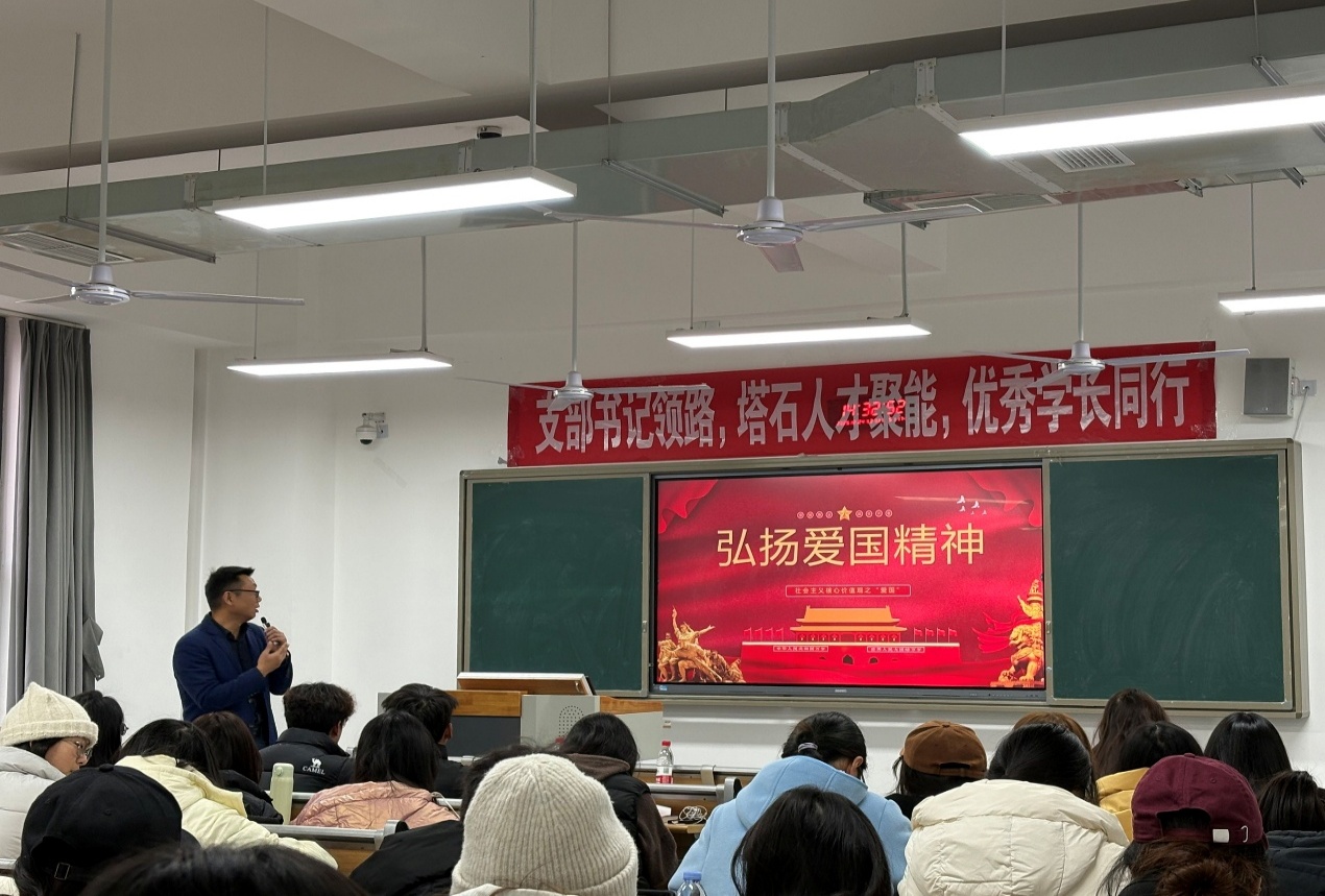 程书记以“什么是爱国、为什么要爱国,怎样爱国”为切入点,回溯中国近代史里从山河沉沦到仁人志士救亡图存的艰苦奋斗历程,剖析出中国共产党之所以能,核心是始终坚守为人民谋幸福的初心,坚持实事求是、自我革命,团结人民攻克一个又一个难关,这也正是爱国情怀最深刻的时代根基,结合当代青年的使命担当,进行了深入浅出的阐述。他指出,爱国并非抽象的口号,而是具体的行动实践——对于青年学子而言,深耕专业学习、锤炼科研本领、积极参与社团建设、主动服务同学,都是爱国情怀的生动体现。他勉励大家以时代为基,立足本职岗位,将“立德树人”的育人目标融入日常学习与社团活动中,在追求真理、探索创新的过程中茁壮成长,努力成为兼具家国情怀与专业素养的新时代青年。