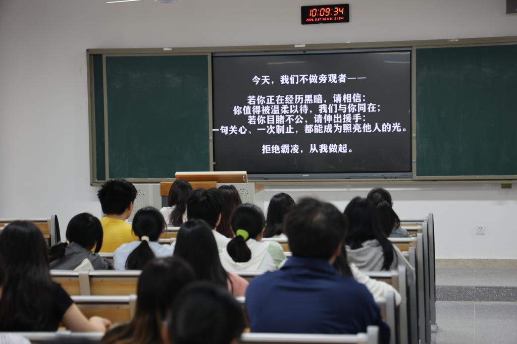 随后,全体人员集中至东区教学楼B101教室开展专题宣传,重点播放了5月25日“帧帧普法彰正义,幕幕护航守校园”活动中拍摄制作的反霸凌宣传片。该片直观呈现了言语羞辱、社交孤立、网络诋毁等霸凌场景,并清晰演示了正确的应对与求助方法,强烈的代入感引发了在场同学的深刻共鸣。志愿者们还系统解读了学校的反霸凌举报渠道与处理流程,并就“如何界定霸凌行为”“遭遇侵害后如何留存证据”等问题进行了解答。