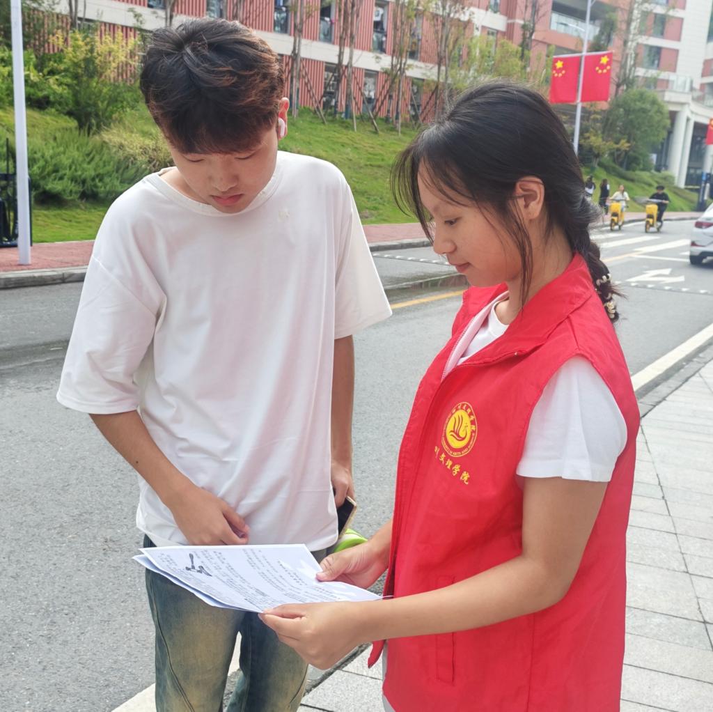 活动正式启动后,志愿者们分区域展开工作。在东区校园内,他们主动向过往同学发放普法宣传单,并结合真实案例,生动讲解校园霸凌的多种隐蔽形式及其深远危害,有力打破了“玩笑无关伤害”的常见认知误区。