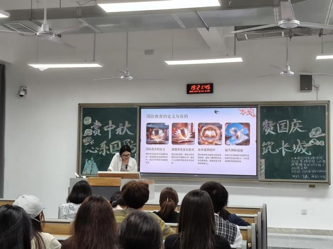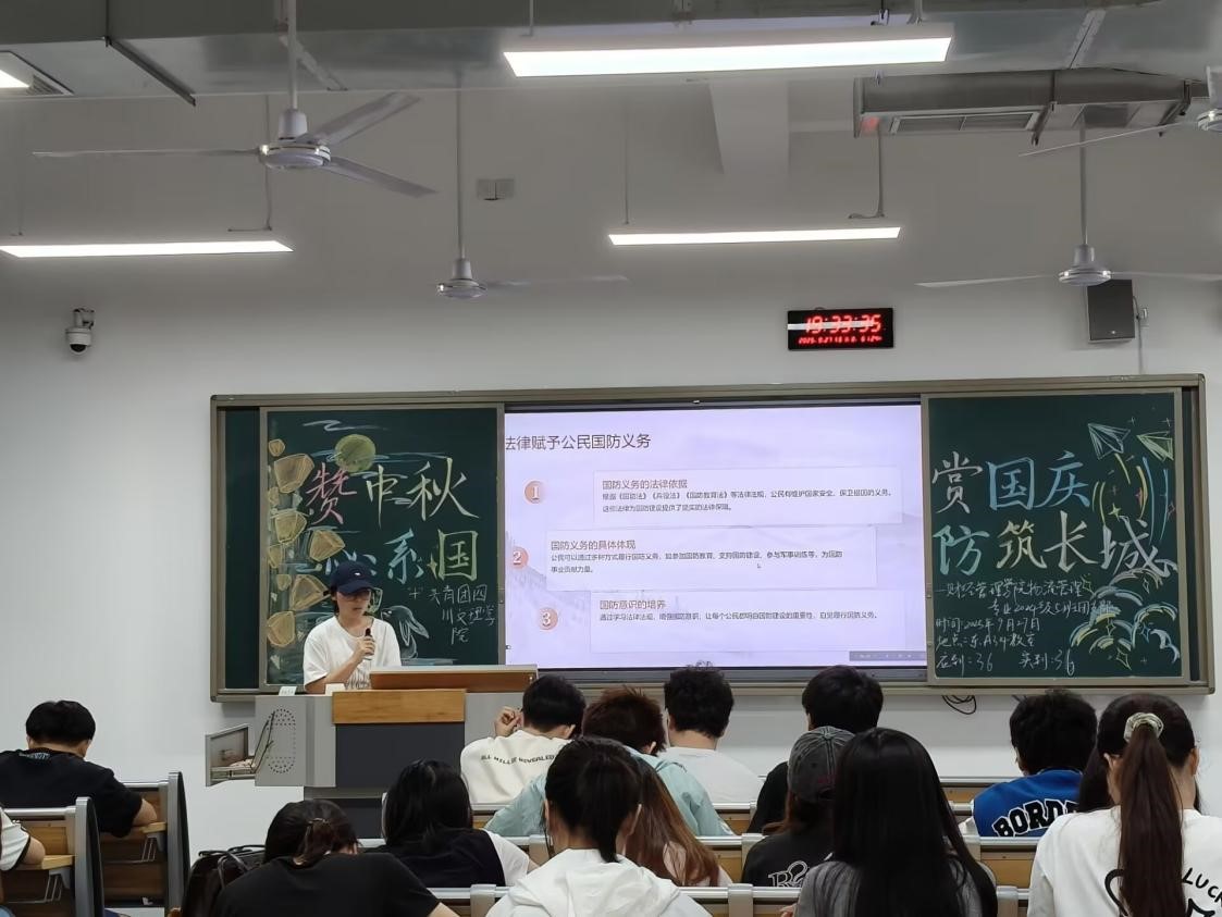 在庄重的共青团团歌声中,各支部活动拉开帷幕。团支书们系统讲解了中秋佳节的历史沿革与文化内涵,加深了同学们对传统节日的理解。在经典诗词诵读环节,团员青年们在隽永的诗句中深切感受了中秋文化的深厚底蕴。活动尾声,一段段展现退役军人卫国戍边英勇事迹的纪实影像,将现场气氛推向高潮,激发了大家强烈的民族自豪感和保家卫国的责任意识,实现传统文化与国防教育的深度交融,推动家国情怀内化为个人的精神追求。活动现场,广大团员青年态度认真、踊跃参与,展现出新时代青年良好的精神风貌。其中,24.5班团支部的表现尤为突出。他们通过精心设计的板报,巧妙融合“团圆”“玉兔”等中秋意象与国庆元素,营造了浓郁的节日氛围。大家纷纷表示,要发扬传统文化,增强国防安全意识,积极参与国防建设。