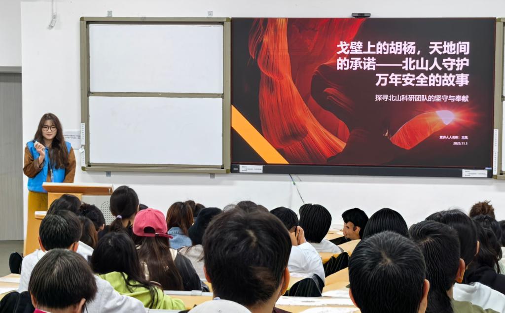 活动以“国家科技成果”为锚点,巧妙地将硬核科技知识与精神传承深度融合。宣讲人王凤以“戈壁上的胡杨,天地间的承诺”为题,讲述了北山高放废物处置场的故事。她从技术原理入手,阐释了天然岩硐与人工屏障如何共同构筑国家核安全的“最后一道防线”;随后,她将视角转向科研团队,通过“帐篷狼嚎”、“一米家书”、“钻杆断裂”等感人至深的细节,描绘了当代科研人扎根戈壁、十年如一日的坚守,其精神内核与“两弹一星”时期隐姓埋名、攻坚克难的光荣传统一脉相承。