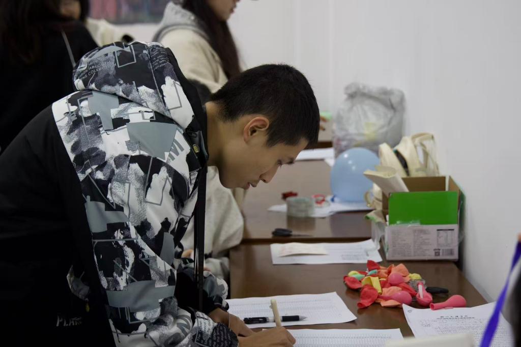本次活动打破了传统单向引导模式,精心设置了“学风知识区”“错题挑战区”和“自省-四问区”三大主题区域。每个气球内都藏有一项知识任务,成功打造了“知识性”与“趣味性”双线并行的沉浸式体验。同学们手持“学风任务卡”穿梭于各区域,通过扎破气球来解锁挑战,扎破气球解锁错题挑战的同学,围着题目热烈讨论解题思路;参与“自省-四问”的同学则认真梳理近期学习状态,在答题中明确了改进方向。活动设置了7次扎球机会,这一规则既保证了参与深度,也让学习反思的过程如同“拆盲盒”般充满趣味。现场气氛紧张而热烈。