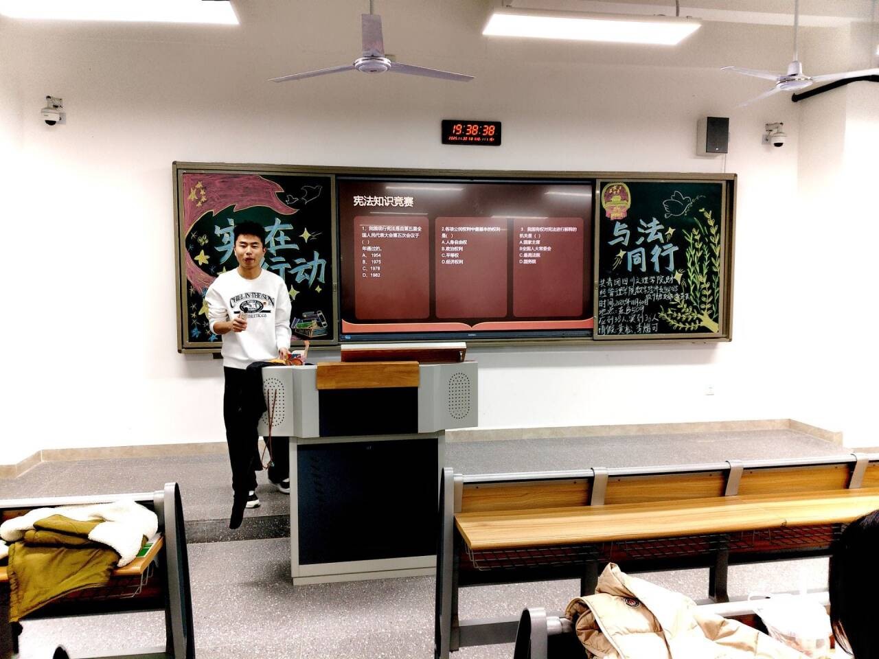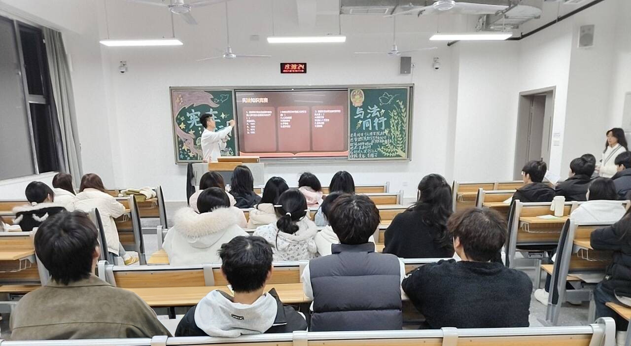 活动在激昂的共青团团歌声中拉开帷幕。各团支部围绕主题精心策划,活动内容丰富、形式多样。团支部书记聚焦“宪法与青年的关系”,结合“受教育权保障”“网络言论边界”“就业公平原则”等青年关切的现实议题,深入浅出地解读宪法核心条款,将抽象的法条转化为生动的“身边权利指南”,使团员们深切感受到宪法对个人成长的守护。