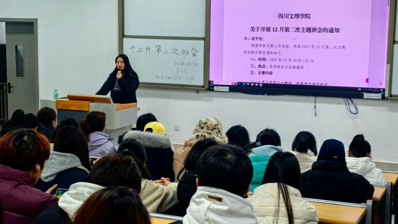 12月21日,学院在东区教学楼组织开展十二月第二次主题班会。本次班会紧扣学校近期工作部署,围绕政策学习、校园治理、专项工作落实三大核心维度展开,切实提升学生思想认识、规则意识与安全防范能力,全面保障学生学习生活有序开展,为学院高质量发展与校园和谐稳定筑牢根基。