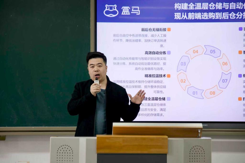 宣讲会上,盒马鲜生宣讲人赵向伟首先向在场学子系统介绍了企业概况。他指出,作为阿里巴巴集团旗下的全资子公司,盒马鲜生开创了融合“生鲜超市+即时配送+数字化运营”于一体的新零售发展模式。通过对企业发展理念、核心优势及行业前景的深入讲解,帮助同学们对新零售业态建立了更加清晰的认知。