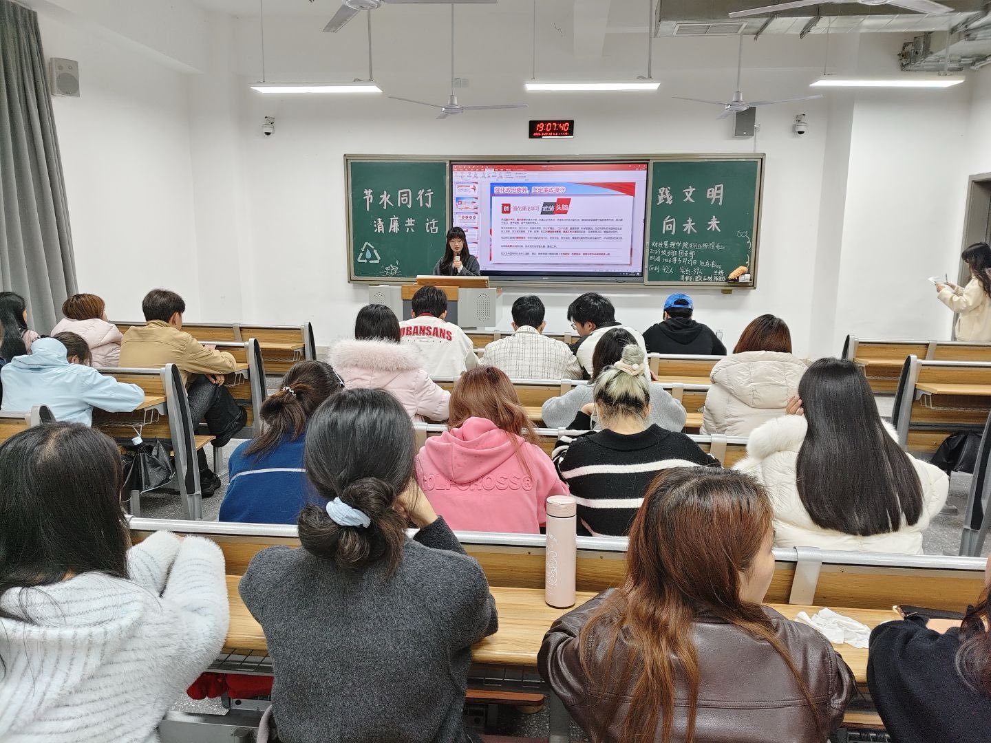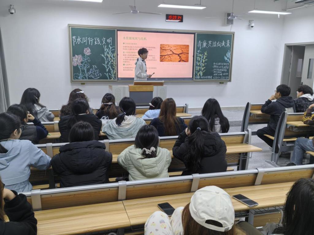 各团支部紧密围绕活动主题,精心策划并设计实施方案。活动初始,全体成员共同高唱共青团团歌,以昂扬的旋律凝聚青春力量。随后,各团支书带领同学们系统学习了节水护水、廉洁修身的核心要义,重点围绕节水文明的重要意义、清廉文化的时代内涵以及青年学子的责任担当进行了系统梳理与深入学习,增强广大团员青年对生态文明建设与廉洁自律要求的深刻认识。接着,团支书组织开展交流研讨环节,组织团员青年们结合自身专业与校园生活,从青年人的角度,分享节水小妙招、畅谈对清廉品格的理解与践行路径,引导广大团员青年在交流与讨论中深化对文明风尚与廉洁精神的认知,凝聚思想共识。活动尾声,通过播放节水文明与清廉文化主题的宣传学习影像,以生动鲜活的内容激励与号召青年学子践行绿色低碳理念、坚守清正廉洁底线,进一步涵养青年学子的文明素养与廉洁品格。活动现场,广大团员青年态度认真、积极参与,展现出新时代中国青年崇尚文明、恪守清廉的良好精神风貌,大家纷纷表示要从自身做起、从点滴做起,争做节水文明的践行者、清廉风尚的传播者。