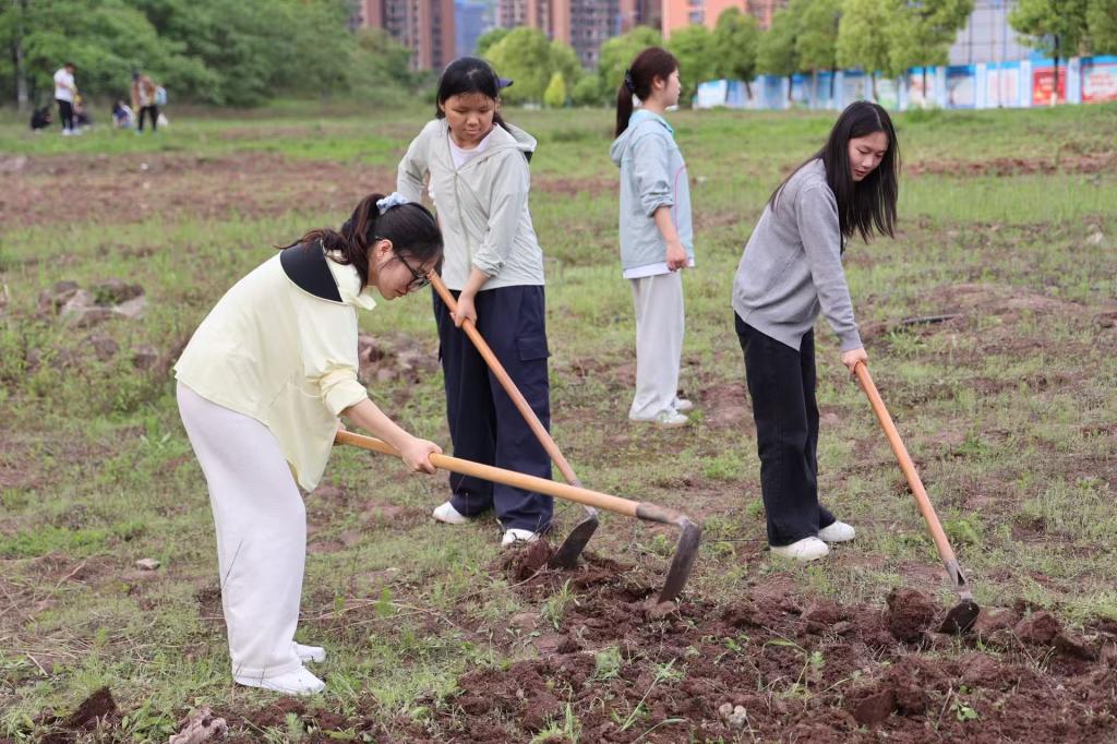 春光里,同学们分工协作:翻土深耕、清理杂草、平整田垄、播撒种子、覆土轻压,每个步骤都一丝不苟。大家在沉浸式劳作中亲近自然,感知生命成长的力量。