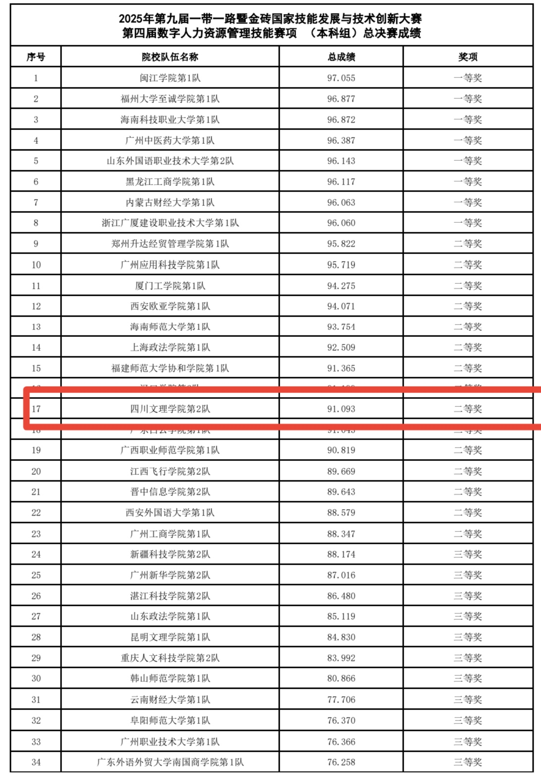 近日,第九届“一带一路暨金砖国家技能发展与技术创新大赛”第四届数字人力资源管理技能赛项全国总决赛圆满落幕。由我校财经管理学院人力资源管理专业学生王成、谢诗繁、曹瀚尹组成的参赛团队(指导教师:刘天、李健),凭借扎实的专业素养和出色的现场表现,荣获全国总决赛二等奖。刘天、李健老师获评“优秀指导教师”。