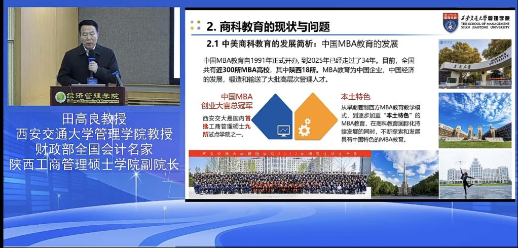 主旨报告环节,西安交通大学管理学院教授、财政部全国会计名家田高良教授以《“人工智能+”时代新商科实践教学创新探讨》为题,从多维度深度解析了“人工智能+”行动的内涵,并结合新商科教育发展现状与现存问题,分享了智能会计人才培养的创新路径及实践成果。浙江大学陈俊教授以《生成式人工智能时代的会计科教创新》为题,系统阐述了智能财务发展的逻辑框架以及财会大模型的发展与应用,同时为大家展示了其团队开发的“智海-大禹”财会大模型,探讨在人工智能时代财务管理和会计专业应该如何进行科教创新,为新一代会计科教创新平台的建设提供新思路。西北大学教务处副处长李辉教授围绕人工智能背景下高校教师数智素养提升这一核心议题给出了相应的思考;西北农林科技大学经济管理学院副院长汪红梅重点介绍该校在经管类人才培养的实验教学方面的改革与实践;广州市福斯特科技有限公司常务副总经理麦全发则从教改、产业及课改三个视角,分享了人工智能与商科课程重构的实践探索经验。在圆桌讨论环节,西安石油大学经济管理学院院长吴勋、西安理工大学经济管理学院副院长甘凯、甘肃中医药大学卫生管理学院院长张勰以及高顿集团副总裁舒畅进一步围绕人工智能赋能新商科教育教学发展展开了深入探讨。